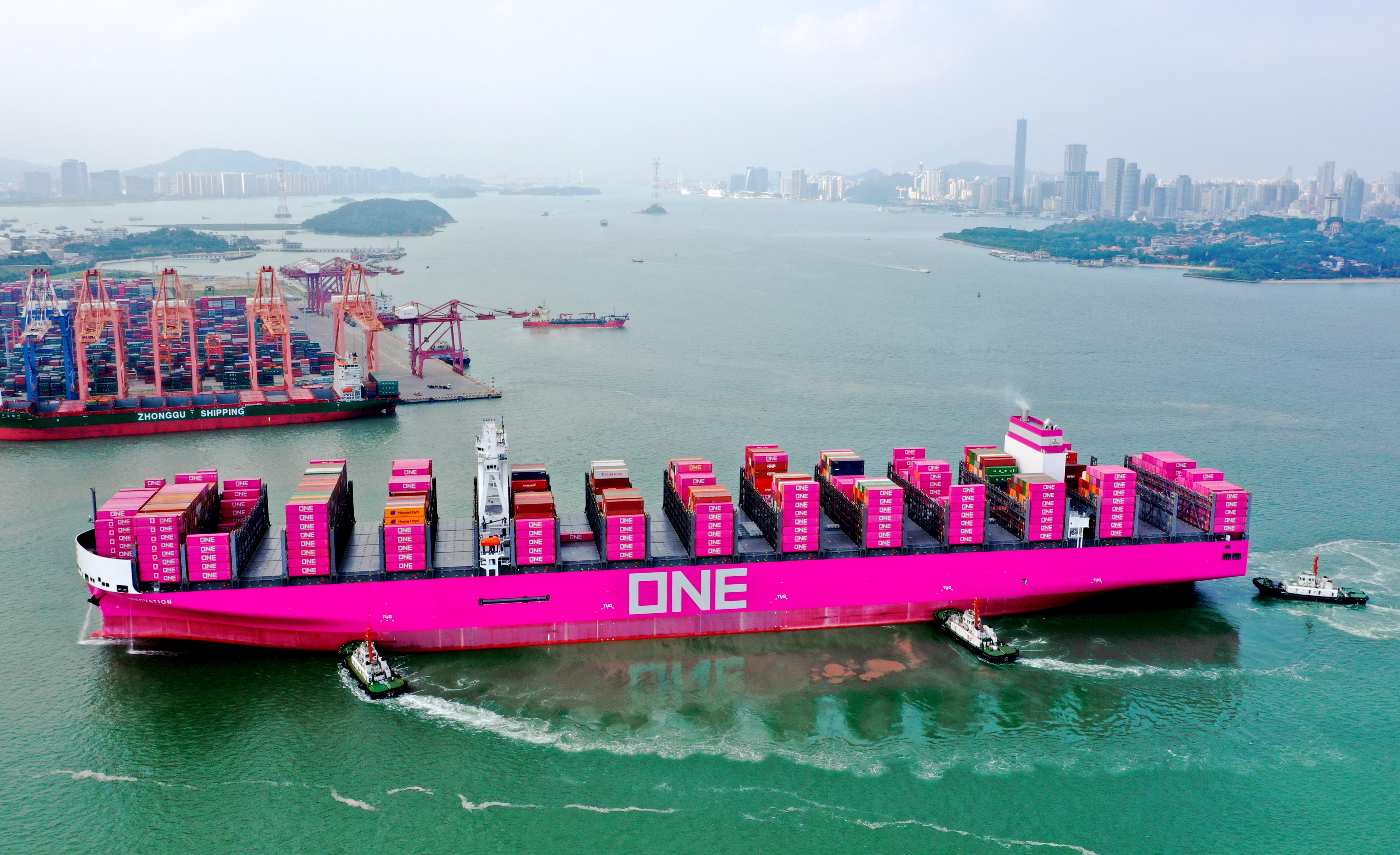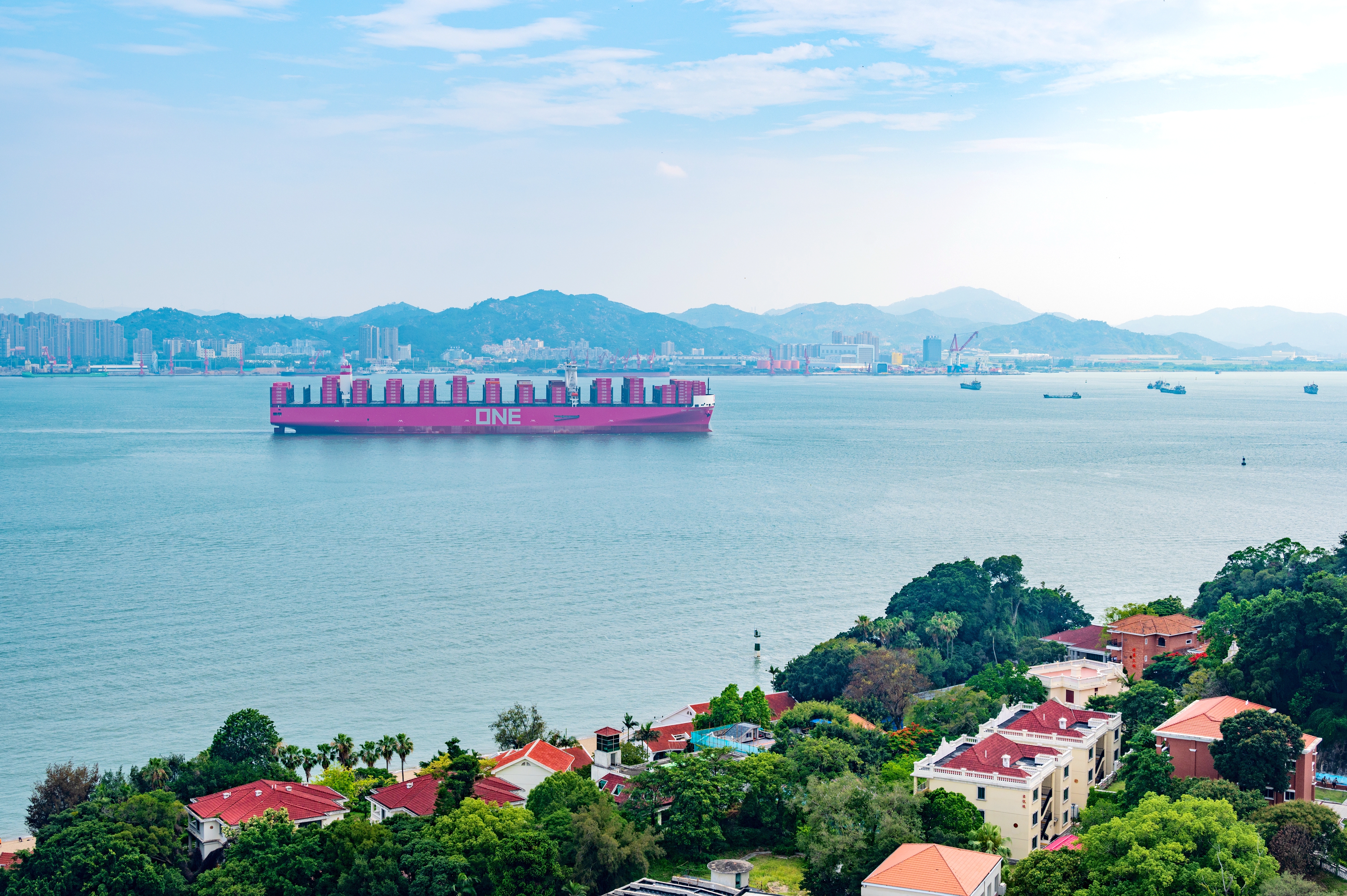 6月8日,厦门港嵩屿码头迎来ONE首艘2.4万标箱巨轮,“第一创新”轮(英文名:ONE INNOVATION)。该轮船长399.95米,型宽61.4米,载重吨22.5万,最大载量为24136标箱。此轮为海洋网联船务订造的6艘同类型船舶中的第一艘,6月2日交付下水,加入THE联盟运营的亚欧航线FE3,此次靠泊厦门港将装载超3300标箱货物驶往东南亚、欧洲。