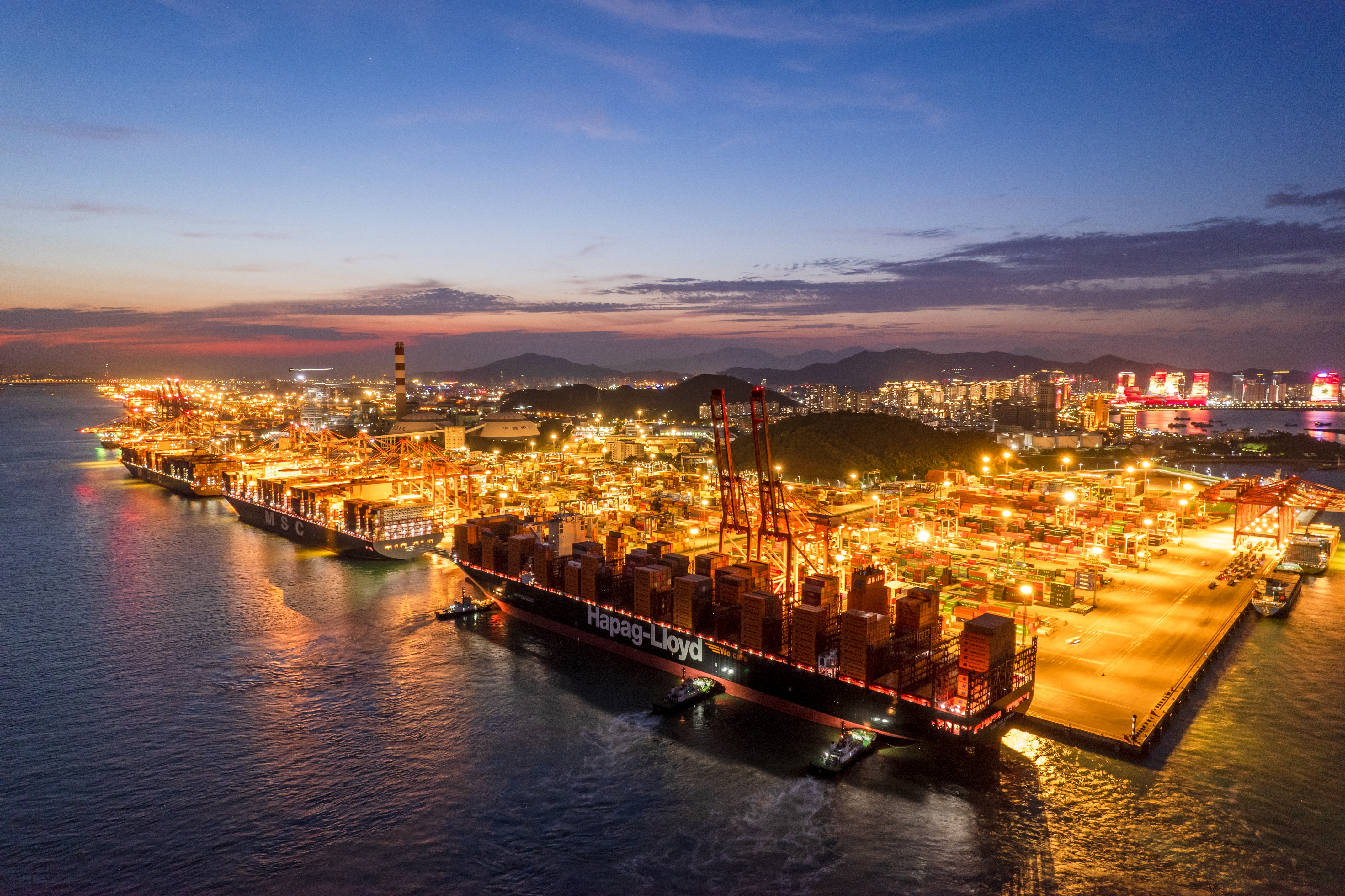 5月15日傍晚,伴随着暮春初夏的夕阳,赫伯罗特航运20万吨级集装箱船舶“新加坡快航轮”驶入海通码头“整齐入列”,与停靠在嵩屿码头的2艘20万吨级的船舶依次排开,正式拉开了厦门港华灯初上的夜间繁忙序曲,标志着厦门港首次迎来三艘20万吨级超大型集装箱船舶同时靠泊作业。夜幕下,三艘“巨无霸”依次排开,红白相间的桥吊吊臂下,吊具抓着集装箱不断穿梭来回,嵩屿作业区2-4号泊位桥吊火力全开,全力迎接三艘巨轮的到访。